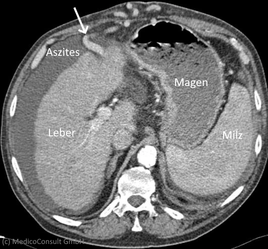 Eine Wasseransammlung im Bauchraum wird als Aszites bezeichnet. Bei portaler Hypertension (erhöhter Druck in der Pfortader) entwickeln sich neben Aszites auch venöse Umgehungskreisläufe, um die Widerstandserhöhung durch die vernarbte Leber zu umgehen. Klinisch imponiert ein Kollateralkreislauf auf Bauchhaut als sog. Caput medusae (Medusenhaupt) oder als sichtbar gefüllte seitliche Bauchwandvenen (siehe Abbildung). Wegen der Bauchwanddehnung bei massivem Aszites bildet sich häufig wie hier ein Nabelbruch.