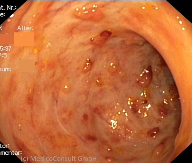 Hochakute (floride) Entzündung der Dickdarmschleimhaut mit entzündlicher Rötung, erkennbarer Schwellung und schmierig-weisslichen Belägen (u. a. Fibrinausschwitzungen). Da noch keine narbigen Strukturen entstanden sind, besteht die Möglichkeit, dass sich die Schleimhaut bei gutem Ansprechen auf eine intensive Therapie wieder normalisiert. Schübe dieser Art können jedoch immer wieder auftreten. Der erkennbare schlierenartige Schleimbelag besagt, dass das Epithel in dieser Beziehung noch funktionsfähig ist.
